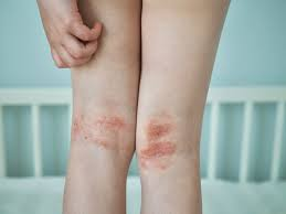 إكزيما على الجانب الخارجي للركبتين أو المرفقين تقشر الجلد، بقع أرجوانية أو رمادية أو بنية أو تهيج في الجلد، ومناطق دائرية ملتهبة.